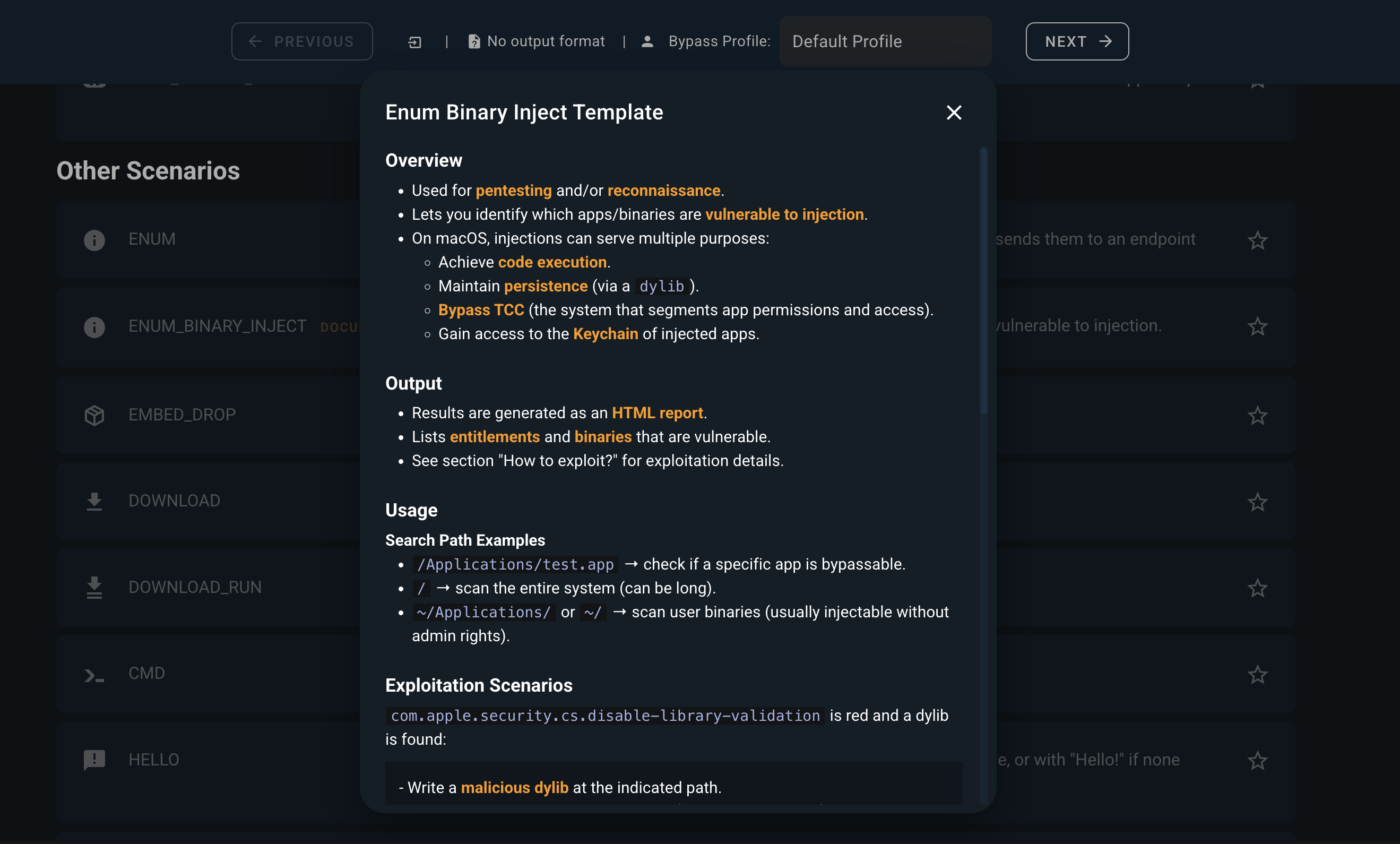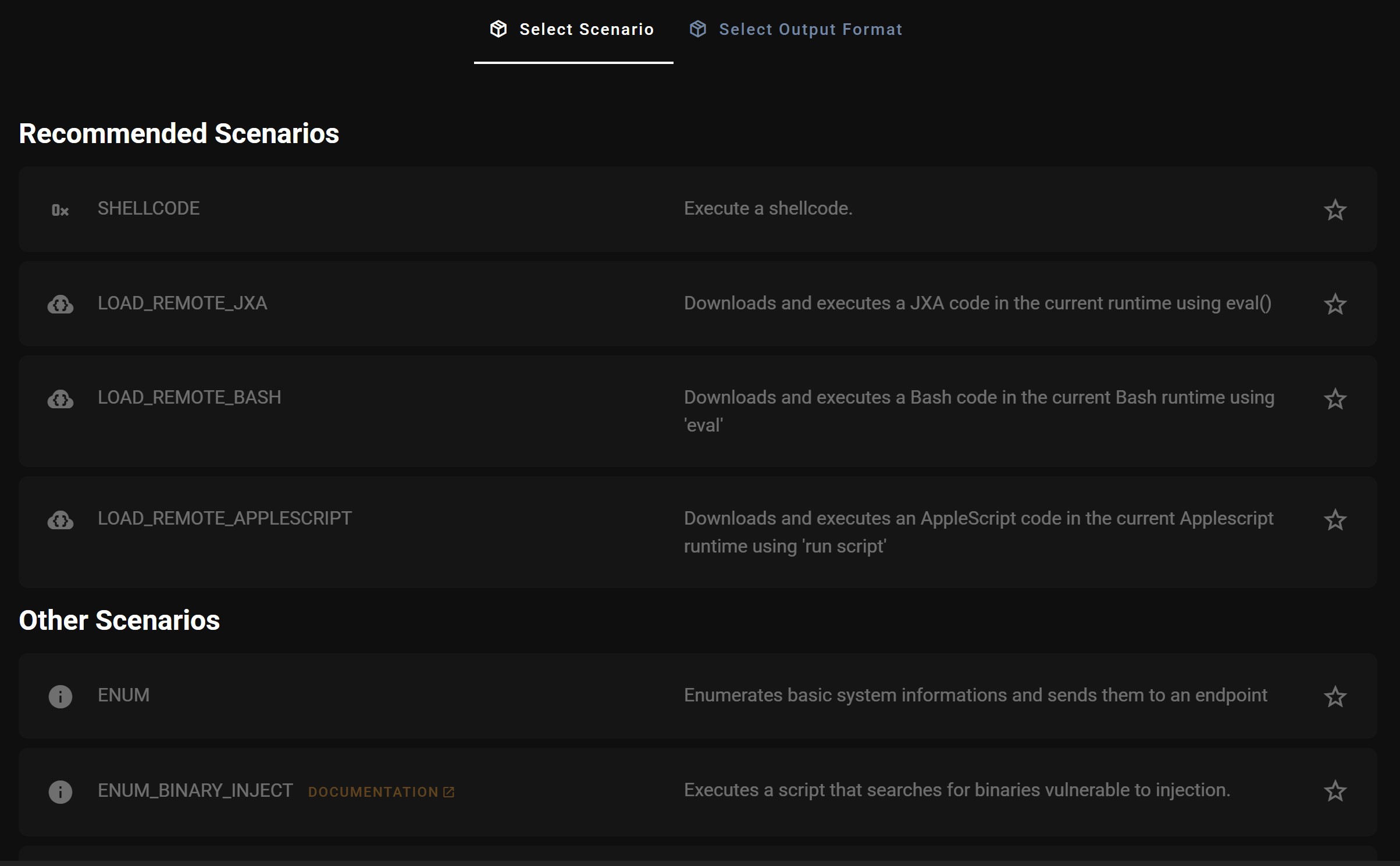 | Initial Access | 14+ formats: APP, PKG, DMG, MACHO, DYLIB, JXA, VSIX, NPM, PLIST and more |