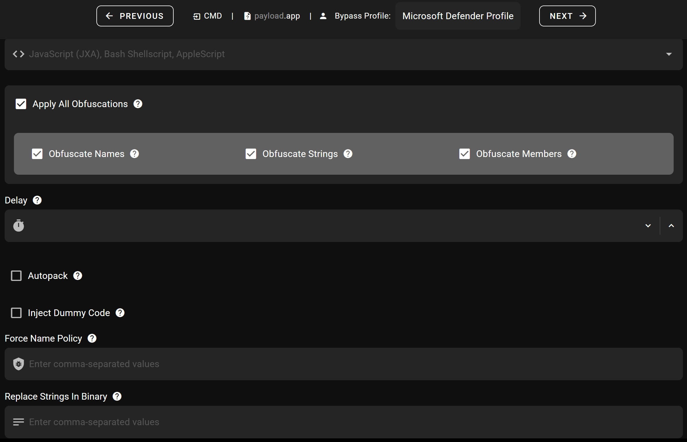 | Evasion | XOR obfuscation, variable renaming, in-memory execution, binary string replacement, auto-bypass mode |